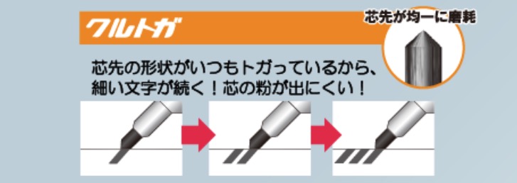 クルトガ最大の特徴は、書くたびに芯が少しずつ回転するクルトガエンジン。芯の片減りを防ぎ、常にとがった状態で書き続けられます。文字の太さが安定し、ノート全体が整って見えるのが大きなメリット。板書を写す場面や、まとめノート作りに強い一本です。