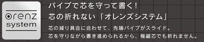 オレンズネロは、0.2mmや0.3mmといった細い芯でも折れにくい構造。ペン先で芯を保護しながら書けるため、細い芯特有の不安定さを感じにくくなっています。文字を細く、きれいに書きたい男子高校生にも扱いやすい。